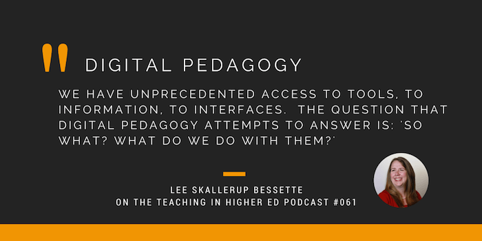 We have unprecedented access to tools, to information, to interfaces, and the question that digital pedagogy attempts to answer is: ‘So what? What do we do with them?’ – Lee Skallerup Bessette