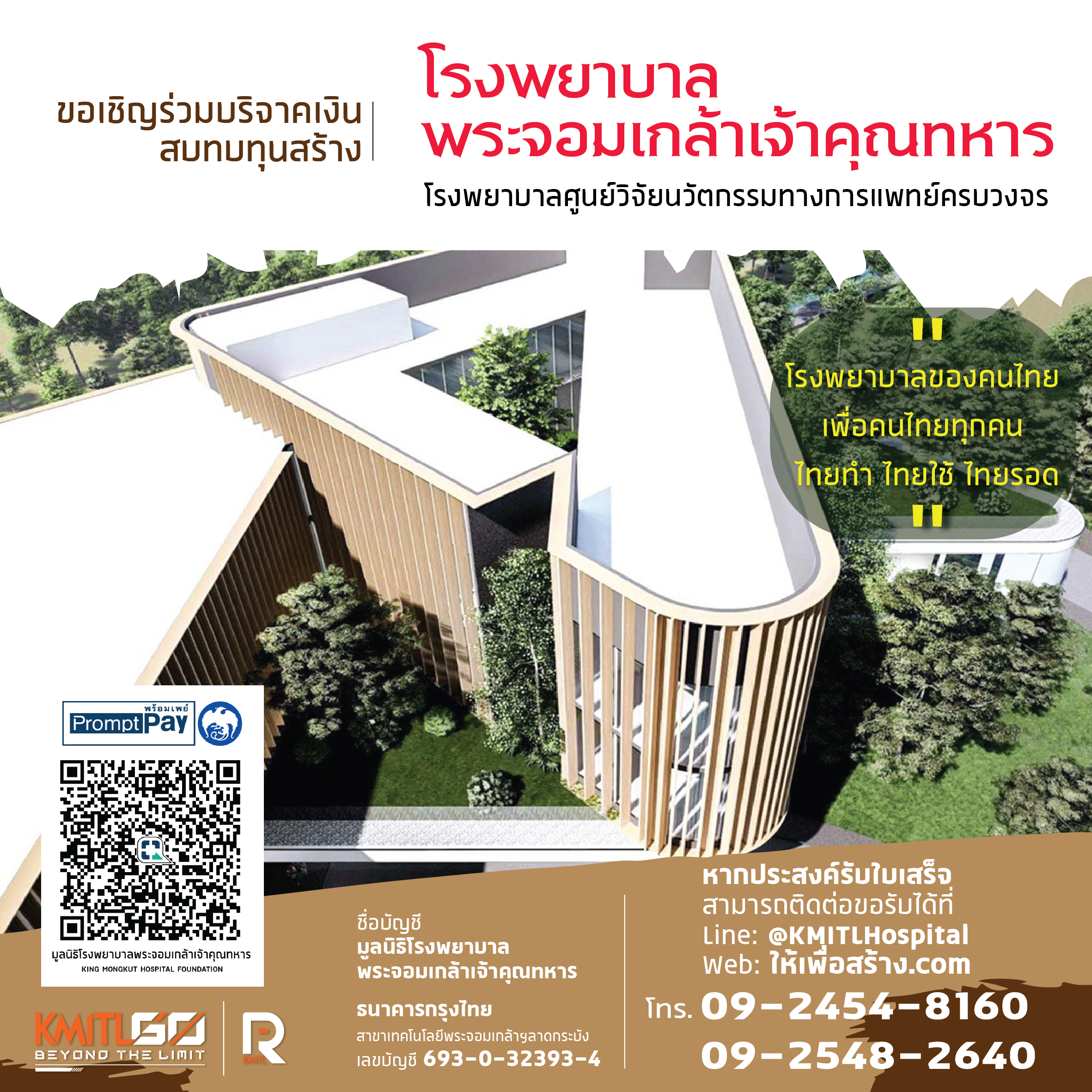 สนใจร่วมบริจาคสร้างโรงพยาบาลวิจัยนวัตกรรมทางการแพทย์แห่งแรกของไทย ดูรายละเอียดได้ทาง เว็บไซต์โรงพยาบาลพระจอมเกล้าเจ้าคุณทหาร