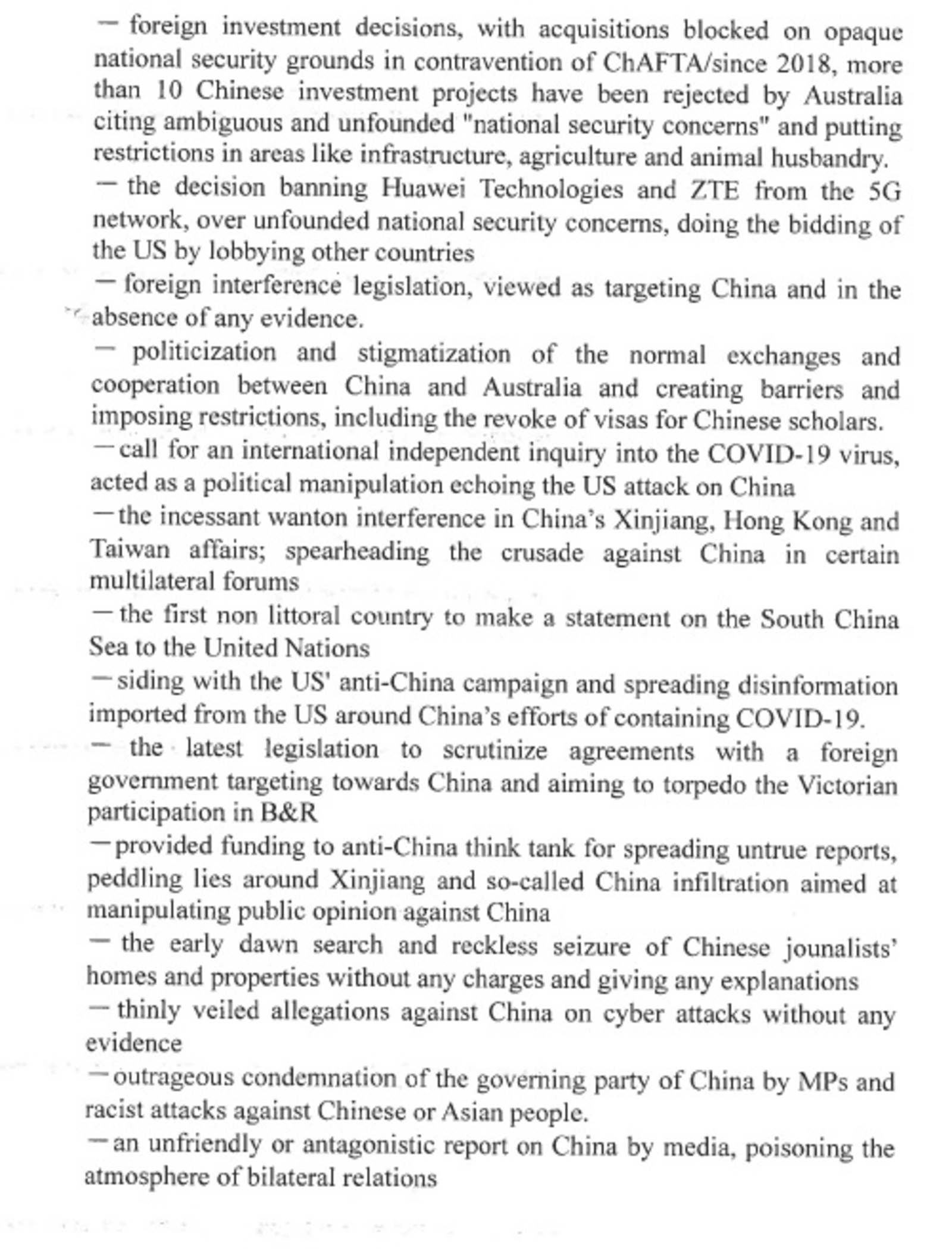 China’s dossier of fourteen disputes with Australia via The Sydney Morning Herald, November 18, 2020