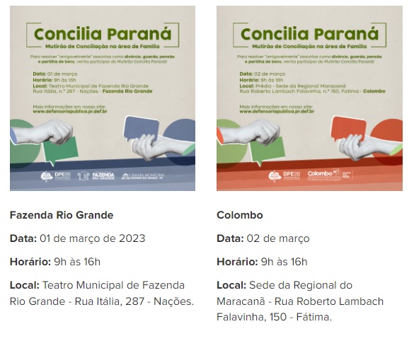 O “Concilia Paraná” é gratuito e atende casos como divórcio, pensão alimentícia, guarda, dissolução de união estável, reconhecimento de paternidade afetiva ou biológica, partilha de bens, entre outros. Segundo a DPE-PR, as partes devem estar em comum acordo.