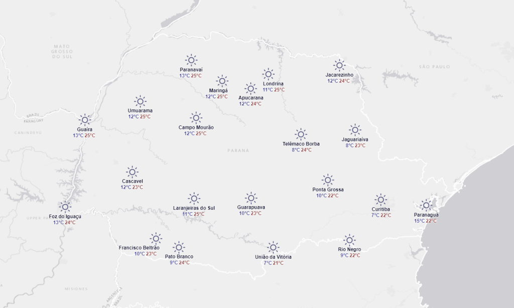 Na capital paranaense, a mínima é de 7ºC e a máxima de 22ºC, segundo a previsão do Simepar. Rajadas de vento não devem ultrapassar os 21 km/h. No sábado o tempo permanece com esse clima de outonoe no domingo o céu fica enconberto.