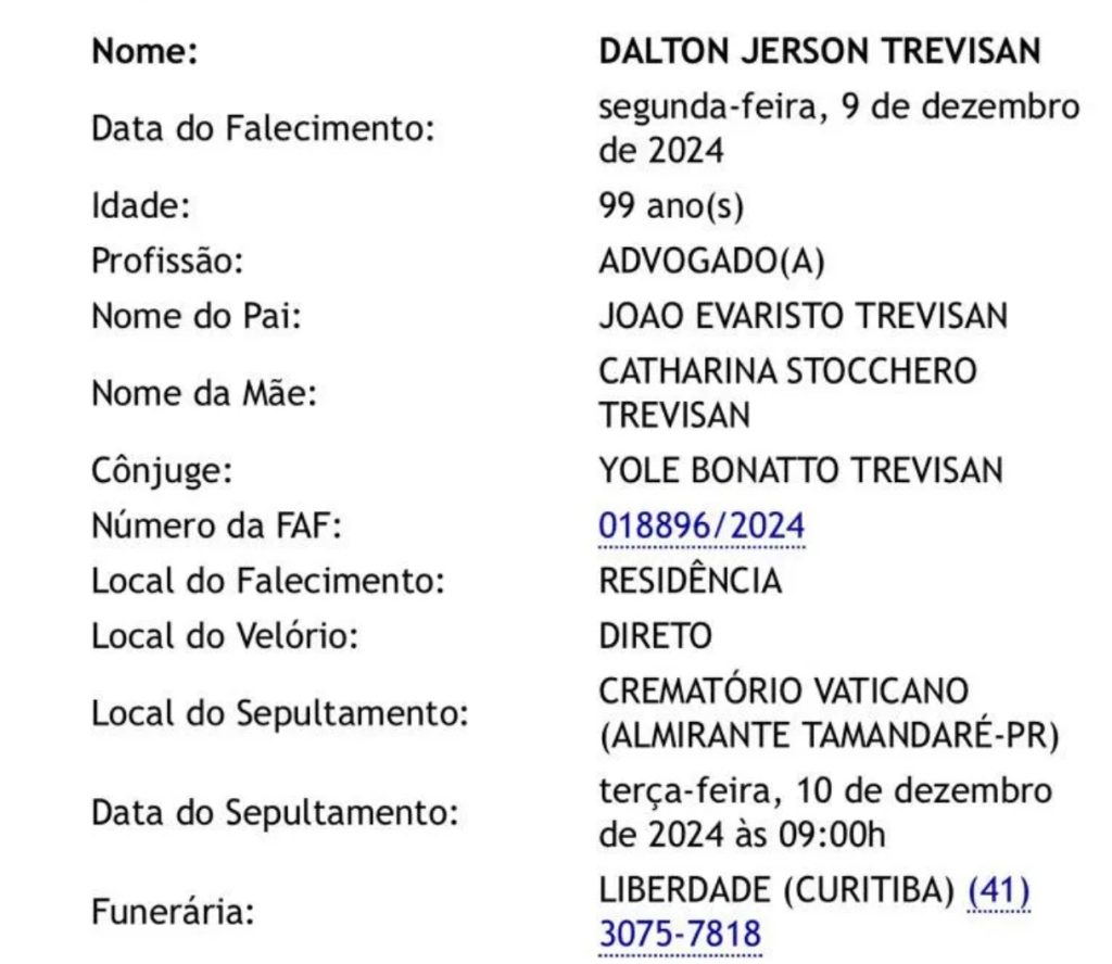 A informação foi registrada no Obituário de Curitiba, da Prefeitura Municipal, e retirada momentos depois.