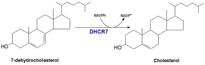 Síndrome de Smith-Lemli-Opitz (SLOS)A SLOS é uma doença autossômica recessiva causada por defeitos na enzima terminal da biossíntese do colesterol: 7-desidrocolesterol redutase (DHCR7). Defeitos neste gene resultam em níveis aumentados de 7-desidrocolesterol e níveis reduzidos (15%-27% do normal) de colesterol.