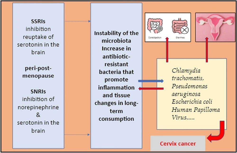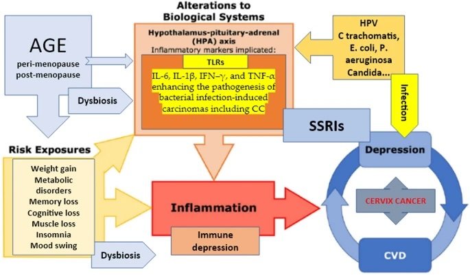 Durante esse período, a imunidade da mulher também pode ser afetada, o que, associado a fatores como o uso de ISRSs, pode aumentar a vulnerabilidade a infecções. Um dos motivos é que a medicação contribui alterações na microbiota intestinal e vaginal (disbiose), tornando o ambiente mais propício a infecções pelo vírus HPV (Papilomavírus Humano), o principal fator de risco para o câncer cervical. O HPV é conhecido por infectar o colo do útero, e em casos persistentes e não tratados, pode levar ao desenvolvimento de células cancerígenas.