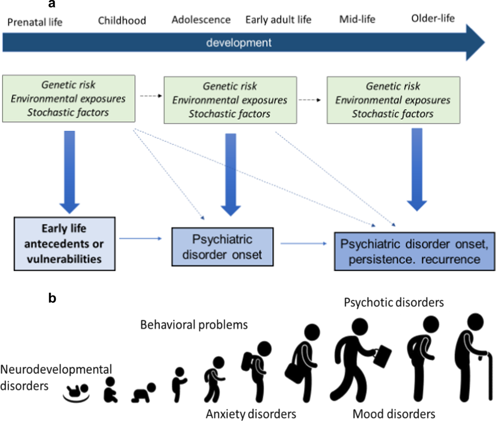 a Uma visão do desenvolvimento dos transtornos psiquiátricos. b Idades típicas de início para diferentes tipos de transtornos (Thapar & Riglin, 2020)