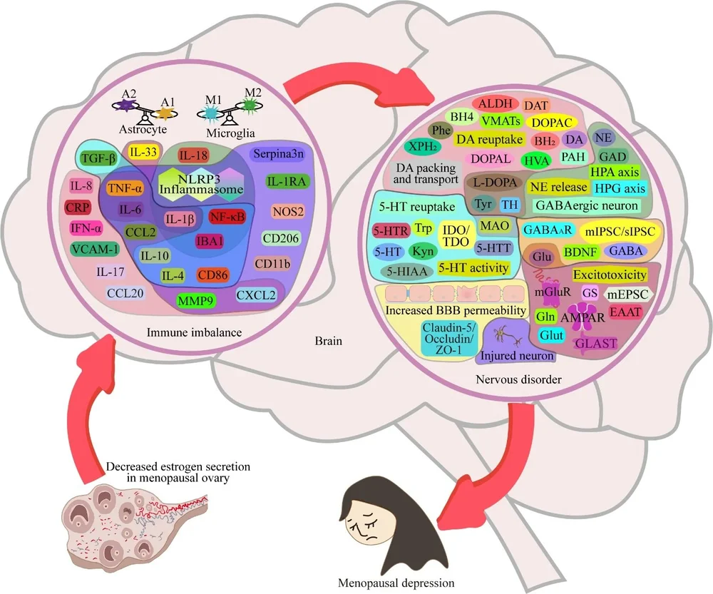 Uma redução significativa nos níveis de estrogênio coloca mulheres na menopausa em alto risco de depressão grave. Com a descoberta de inflamação anormalmente elevada em mulheres deprimidas na menopausa, o desequilíbrio imunológico se tornou um novo foco no estudo da depressão na menopausa. A deficiência de estrogênio interrompe a homeostase imunológica, especialmente os níveis de citocinas inflamatórias através das vias de sinalização NLRP3/NF-κB associadas a ERα/ERβ/GPER. Gera ainda disfunção da barreira hematoencefálica, na produção de neurotransmissores, bloqueia a síntese de BDNF e atenua a neuroplasticidade causada pela atividade de citocinas inflamatórias,.