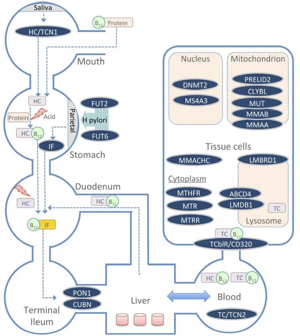 Muitos genes influenciam a absorção e metabolismo da B12. Estes genes aprecem circulados na cor azul na imagem abaixo: