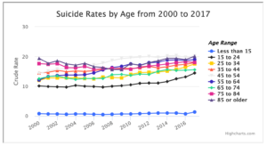 If we use this as a measure of mental health, back then, American children are doing ok on world standards. – World average 7.4/100,000. US 8.0/100,000. But as we have moved into the 21st century, suicides among adolescents in the U.S. have risen as you can see from this more recent study. The graph is confusing but pick out the black line with the diamonds that represents the 15-24 year olds and you will see a very definite uptick, now with a rate of 14.46/100,000.