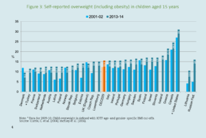 We have all heard about the obesity epidemic among American children but do you really understand the magnitude of the crisis? 31% overweight and 17% frankly obese. Our children are off the charts outliers on world standards. You can easily see this by looking at obesity rates among 15 year olds by country.