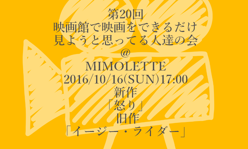 映画館で映画をできるだけ見ようと思ってる人達の会@MIMOLETTE、第20回は新作は「怒り」、旧作は「イージー・ライダー」を課題映画としてゆーるく語ります。それぞれの映画に関して語りたい皆様の参加をお待ちしてい\ます。