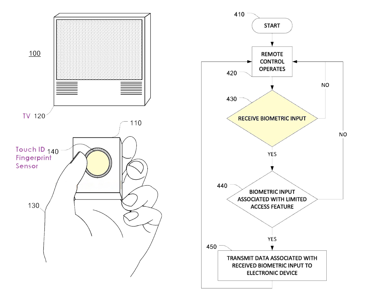 Согласно новому патенту, Apple изучает возможность интеграции своей биометрической технологии Touch ID в пульт Apple TV или пульт для домашних автоматизаций. Как сообщает компания Patently Apple, данная модель пульта предназначена для управления телевизором, устройствами умного дома, открытия дверей, управления техникой и прочими устройствами с применением биометрической аутентификации.