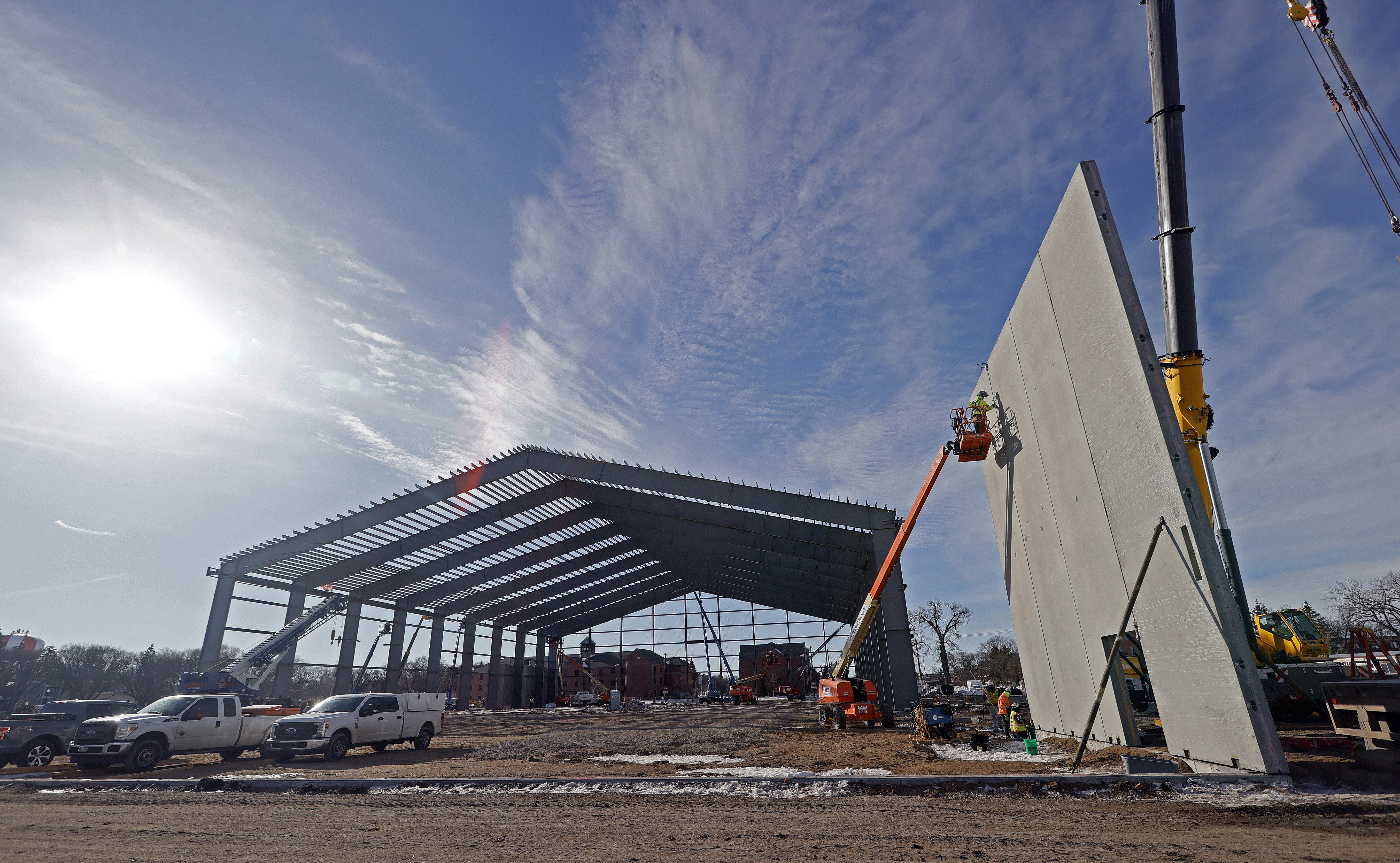 FARGO It’s not as if anybody will see the following on Facebook marketplace. For sale: used indoor bubble, 360 x 180 feet, some imperfections but still usable. Maybe. Sometime toward the end of April or the beginning of May, the North Dakota State indoor bubble will come down for the last time with destination unknown. Also unknown is if it has any value. “It’s state property, something that could go to surplus if a buyer or somebody is interested,” said NDSU athletic director Matt Larsen. “If not, maybe some pieces of it are salvageable. I know there are a lot of people who can’t wait to take it down for the last time.” The days of putting it up in the fall and taking it down in the spring are over with the new $50 million Nodak Insurance Football Performance Complex in the early stages of construction. Even Larsen, who was on the ground floor of the planning, is taken aback by the size of it. Motorists driving by North University Drive will notice the facility dwarfing the neighboring Sanford Health Athletic Complex. “Massive is the best way I can describe it,” Larsen said. “I’ve been staring at two-dimensional drawings for a long time and it’s 75 feet high (on paper). But to see it … a massive, massive complex.” The steel columns and beams and precast concrete walls going up are phase 1 of the project. Phase 2 will be incorporated into the ongoing construction, although there is still some approval work yet to be completed with the North Dakota legislative budget committee. NDSU obtained approval in 2018 to begin fundraising for the $37.2 million first phase and will ask for approval of the remaining funds for phase 2 on March 30. A $15 million gift in December from NDSU graduate Tom Blattner quickly put the university over the top in reaching the $50 million goal. The latter phase includes a locker room, weight room, training room and equipment room. All funds have been externally raised. Construction on a storage warehouse on the southeast side of the main structure is expected to begin soon. Larsen said grading the outdoor surface for artificial turf should also begin this spring. The entire project is on schedule, he said, although the timeline for the start of Bison football practice in August could be touchy. NDSU may not be able to use the indoor field for most of August. “They’re moving, every day something changes,” Larsen said. Meanwhile, with the indoor bubble permanently going away, the athletic department is planning some minor renovations to Dacotah Field to make it even more of a complete home to the Bison soccer program. They include new lights and renovating the press box. ]]> |