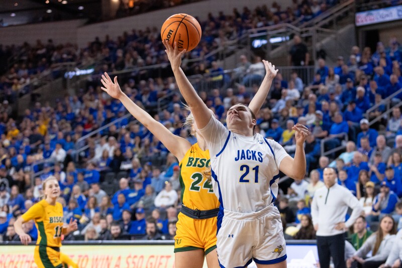 That doesn't mean the game was over early. Anything but. Despite getting down, the Bison hung in there. Even after falling behind by six points after a three-point play by SDSU's Brooklyn Meyer with 6:55 left in the fourth quarter that had the blue-clad crowd roaring, NDSU scored five straight to get within 47-46.