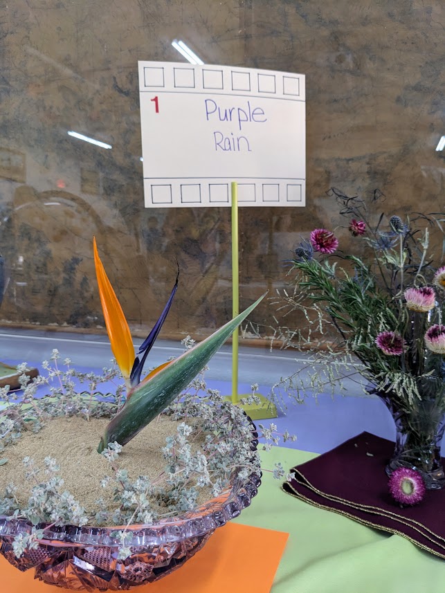 Category 1: Purple Rain Arrangements made using perfect translucent sun-purple glass with fresh plant material only, not necessarily native.