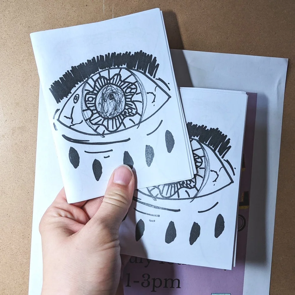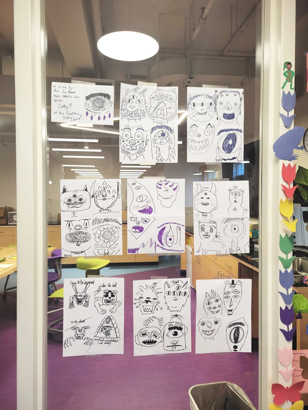 We made three whole zines together! First, we started with learning what zines are, which are self-published magazines about whatever you want! We looked at a lot of cool examples from comic zines, to perzines (personal), to essays, to art zines. Then we had a fun warm-up drawing activity, which resulted in our first zine! We voted on titling it “Untitled Monster Eye Zine.” We learned how to copy, fold, collate and staple completed zines.