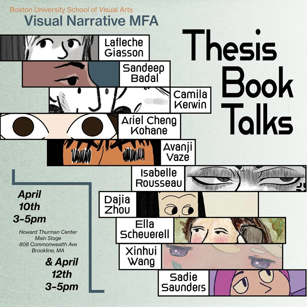 I have had the pleasure of teaching a wonderful group of grad students this year in Boston University’s new Visual Narrative MFA program! The courses I teach are the thesis studios, so we worked together all year developing their final thesis projects. All these incredible students developed books and graphic novels, created beautiful sample pages, and completed a final book pitch.