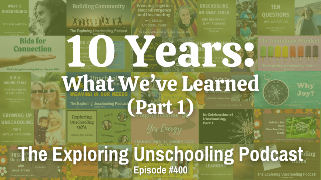 Hello and welcome, everyone, to episode 400 of the Exploring Unschooling podcast. This year also marks 10 years since I started the podcast. The first episode went out January 10th, 2016 and it all just feels a little surreal yet meaningful for me. And not so much in that celebratory, look how long we’ve been doing this, yay! That is very cool. But in the more reflective sense that 10 years really is a good chunk of time, right? Enough time for thoughts and ideas to grow and change, to strengthen and wither.