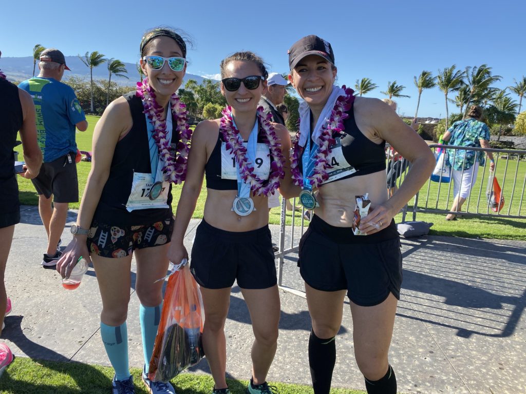 Tamanna (left) with Natalie from MetPro (center) and Coach Angie (right) at the Revel Kulia Marathon