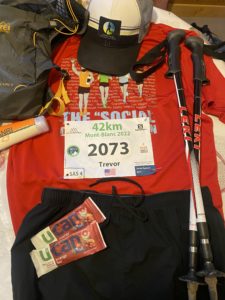 Besides the mandatory equipment like a cup, I brought a new 1.5 liter hydration vest I found at REI. Compression socks. Path Project shorts with the base layer (Love them!). Small roll of electrical tape in case I got a blister. Blue MTA trucker hat and Goodr sunglasses. On Cloudventure trail shoes which I have lived a good life. Leki Trekking poles -which I wouldn’t go without! 2 UCAN bars (the only thing I ate). Tanri sunscreen.