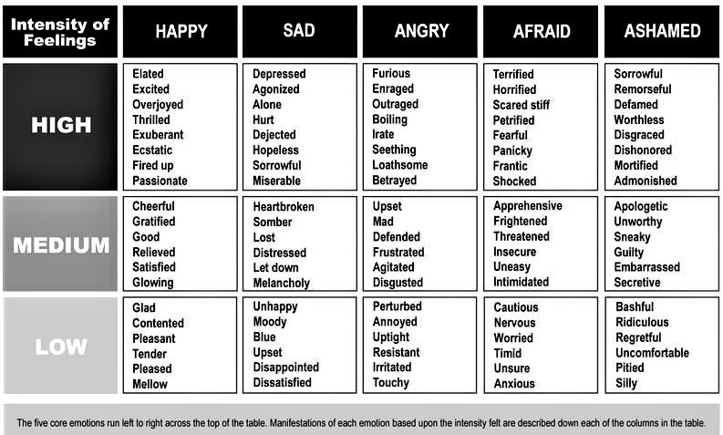 Identifying emotions, also called emotion spotting, helps the rational brain take power back from the emotional brain in real-time. To facilitate this it is helpful to use an emotions chart like this one:
