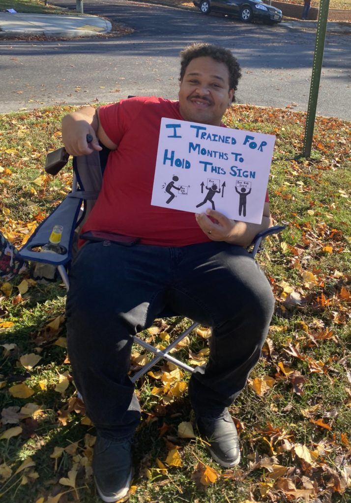 “I trained for months to hold this sign”.