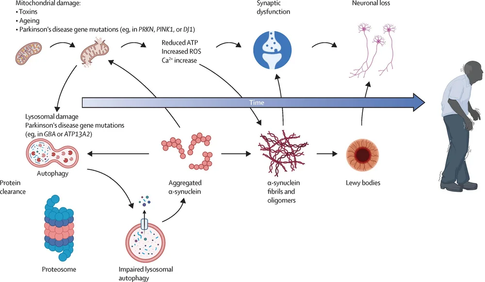 3. Danos em outros sistemas neurológicos4. Disfunção mitocondrial e estresse oxidativoA função mitocondrial é comprometida nos neurônios dopaminérgicos, gerando excesso de radicais livres. Causas: Exposição a toxinas, envelhecimento, ou mutações em genes relacionados à DP, como PRKN, PINK1 e DJ1. Efeitos: O dano mitocondrial causa: Redução da produção de ATP (energia celular). Aumento de espécies reativas de oxigênio (ROS, radicais livres). Elevação dos níveis intracelulares de cálcio (Ca²⁺), levando à disfunção neuronal. Danos às proteínas, lipídeos e DNA celular, acelerando a degeneração neuronal.