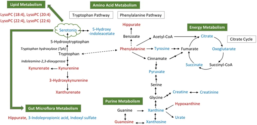 Vermelho: metabólitos que aumentam na deficiência de serotonina (ou marcadores alterados). Azul: metabólitos reduzidos. Preto: conexões enzimáticas ou caminhos principais. Setas verdes: indica fluxos metabólicos que ligam serotonina a outras vias (lipídios, microbiota).