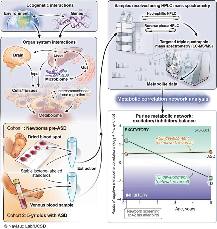No estudo “Metabolic network analysis of pre‑ASD newborns and 5-year-old children with autism spectrum disorder” (Lingampelly et al., 2024), pesquisadores investigaram como o metabolismo difere em crianças que desenvolvem autismo. Eles analisaram amostras de sangue seco de recém-nascidos que mais tarde foram diagnosticados com autismo e também de crianças de 5 anos já diagnosticadas. O objetivo foi identificar padrões metabólicos que possam servir como sinais precoces ou ajudar a entender os mecanismos do autismo. Foram analisados cerca de 450 metabólitos e 50 vias metabólicas. Das análises, 14 vias se destacaram, sendo responsáveis por 80% do impacto metabólico observado. Entre os achados, crianças com autismo ou em risco mostraram aumento de moléculas associadas ao “stress” fisiológico (como lactato e ceramidas) e redução de antioxidantes e defensas anti-inflamatórias (como glutationa e CoQ10).