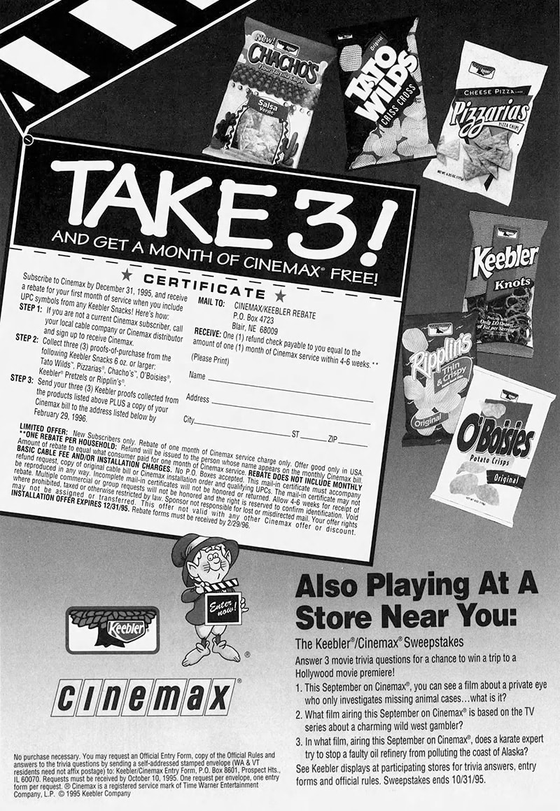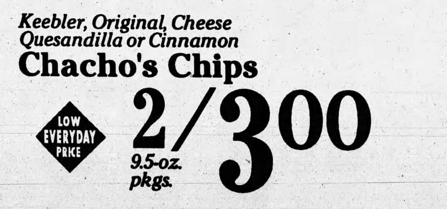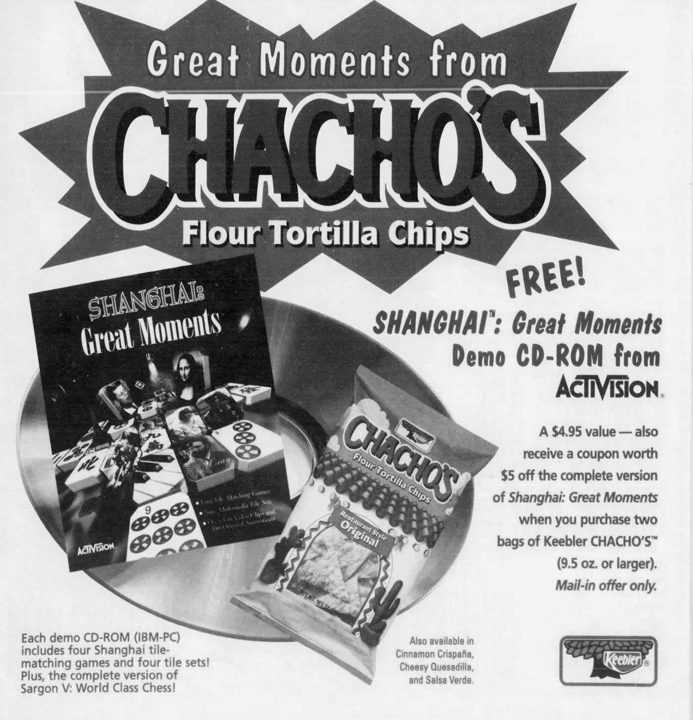 I am not sure when I had my first tortilla chip. I am pretty sure it was a Bravo, which was the Wise companies’ answer to Doritos. Wise was big in my area, and I tended to be loyal, but when I had my first Dorito, I was smitten, and it became one of the top snack chips in my life. I didn’t think anything had a chance to get between me and those wonderful nacho cheese triangle chips, but in March of 1993, Keebler unleashed the Chacho upon the world. They weren’t exactly the same, but for at least a year after their release they were giving Doritos a run for their money. Throughout my life, I have always loved walking through grocery stores looking for something new and the Chacho hit a sweet spot in its crossover appeal. I enjoyed the tortilla chip, but up until this point, I had only ever had ones made with corn, this one was made with flour. Of course, I didn’t know that at the time, I just saw a new snack food from Keebler, and took it home. As soon as I tasted it though, I knew it was different. The texture was lighter, so I consulted the bag trying to figure out what was different. I would like to say I was savvy enough to understand the label and spot the difference, but I had to go to my sister who quickly figured out that it was the flour vs. corn. Support the Retroist on Patreon It wasn’t just the texture that made Chachos interesting when compared to existing snack chips. They also added an interesting snack chip flavor to the mix. When you thought about tortilla chips in this era, probably two flavors came to mind first, plain and some sort of cheese flavor. Chacho had those covered. Their plain offering was nice and salty without too much of an oily taste that you often got with similar chips. Their cheese variety was called, “Cheesy Quesadilla.” I was instantly attracted to the cheese-flavored (who wouldn’t be) and I liked the taste. If I were to describe them now, it would be by comparing it to chips that exist today, like a Dorito. By comparison, the chip itself tasted lighter and maybe flakier in some way. Flavor-wise they were also much milder. They weren’t light on the spice, but compared to the densely coated Dorito, they were much more subtle. At first, I found this charming, but after a few bags I realized that I was hooked on the more flavorful offering from Frito Lay. Luckily Chachos had a flavor that was unique amongst snack chips. Just as an aside, I want to congratulate Keebler for using the word quesadilla in a product at this time. While, a lot of people in the United States were getting more acquainted with the word at the time, in many areas of the country it was still a word someone might read, but not really know how to pronounce yet. Then Keebler ran this great commercial that not only spells it out clearly, but also give a pronunciation. I know at this point in my life I knew how to pronounce it, but I am pretty sure this would be the first time older members of my family had heard and saw the word. I mentioned two of the Chachos three flavors, the third one is what really made them stand out, Cinnamon Crispana. Never before did I have a cinnamon flavored snack chip from the grocery store and for the life of me, I cannot understand why they aren’t more popular. I was quickly taken with them and for about a year after they launched they were usually on my family’s shelf. The cinnamon flavor was clever since it took a shape and style associated with salty chips and pushed it toward something closer to a sweet snack, which was unusual on a shelf where sweet usually meant cookies or cereal rather than something shaped like a tortilla chip. I wasn’t the only one who appreciated Cinnamon Crispana. A few years after they were released, I found a Super Bowl Recipe article and Rite Huffman sent in her simple, but delicious-sounding Cool Whip and Caramel Dip. What did she suggest you dip in it? Cinnamon Crispana Chachos, of course. In 1995, they added a new flavor to the lineup, Salsa Verde. Another interesting addition to the lineup, it too had a mild flavor, but to its credit it was also slightly different from other chip offerings at the time. Unfortunately, it didn’t catch on and is hardly remembered. Although it was featured in a Keebler/Cinemax contest in late summer of 1995. Can you answer these trivia questions? They also did this interesting partnership where you could send away (with 2 UPC Codes) for a Demo CD-ROM that included four Shanghai tile matching games plus the complete version of Sargon V: World Class Chess. It really captures the tech level of the mid-1990s. Chachos made their first appearance in supermarkets in March of 1993. The earliest appearance I can find is from the 13th. While they probably went through testing in select markets before this, I am guessing this was the start of the nationwide rollout because after this mentions of them would start to spread. One of the first mentions of Chachos from March of 1993. Notice the typo. They stopped appearing in stores just about three years later with the final mention of them I could find from a store selling them in Flint, Michigan on March 4, 1996. They are actually slightly cheaper per bag than they had been during their introduction. The final mention of Chachos I can find from March of 1996. Chachos faded out because they never found a strong place on the shelf, and they were trying to survive in a space ruled by the Doritos juggernaut. They were sold as a tortilla chip, but the flour base gave them a taste and texture that felt off to people who expected corn. Even the cinnamon flavor, which had some novelty, did not turn into steady repeat sales. Stores also moved them around instead of giving them long runs, and Keebler already had a crowded snack lineup that pulled attention away from them. For the people who liked them they were distinctive, but they never built the broad audience they needed to stand up to an established brand that dominated the category.