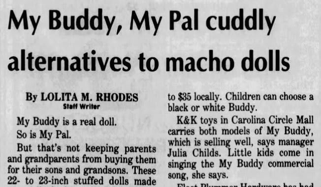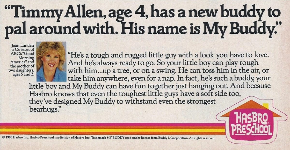 I was never really a doll kid. Action figures were fine, and I liked stuffed animals, especially bears. Those were easy to love. Dolls that looked like actual children just never appealed to me. I understood why other kids liked them, and I never thought there was anything wrong with that, they just were not my thing. As a kid in the eighties, I leaned toward toys that did something, or let me build or arrange something. I liked toys that suggested action or purpose, rather than ones that mostly sat there and waited for me to imagine everything about them. So when the My Buddy commercials started running constantly during Saturday morning cartoons, I knew pretty quickly it was not for me. They were selling the idea of a built in human-like friend, made of fabric and stuffing, who would always be there for you. That was fine as a concept, just not one that spoke to me. In retrospect, what really stood out was how carefully it was framed, a doll for boys, complete with overalls and a baseball cap. It felt like someone assumed the problem of selling dolls for boy had never been dolls themselves, only the clothes they were wearing. Support the Retroist on Patreon My mom was very determined that I should have a Cabbage Patch Kid when they came out, even though I never asked for one and did not show much interest. It was not a bad toy, it just wasn’t one I connected with, and it spent most of its time in my closet. I did not feel much affection toward it, but it did teach me something useful. I learned that if I was not clear about what I did and didn’t want, things could still show up anyway, sometimes wrapped and waiting on Christmas morning. So when the My Buddy commercials started airing, I made a point of letting my mom know early on that this was not a toy I wanted. Even if I could sing the jingle by heart. That warning worked, and Christmas morning came and went without a My Buddy under the tree. Avoiding ownership, though, did not mean avoiding the toy itself. The commercials were everywhere, and I couldn’t stop singing that jingle. When I went to the toy store, I saw the boxes stacked high. The push was so constant that even without owning one, I ended up remembering My Buddy more then some toys I actually owned. That is probably why, years later, I started wondering where the whole idea came from, and how a toy company in 1985 landed on the notion that what boys really needed was a stuffed doll dressed in overalls. When I finally looked into it, the answer turned out to be pretty practical. By early 1985, Cabbage Patch Kids had been such a massive hit that toy companies were openly trying to figure out how to stretch that success without starting over. Articles from the time talk about My Buddy as a close relative, not a brand new idea, just something aimed a little younger and clearly marked as being for boys. It was meant to be a best friend more than a plaything, soft and familiar rather than an “active” toy. They were looking at the biggest trend of the moment and hoping it would carry a little farther with a new audience (the half that they might have been missing). An alternative to macho dolls By the fall of 1985, the conversation around My Buddy had become very interesting. In a November Greensboro News and Record article, they go into detail about the doll nature of the toy. These were meant to be an alternative to the macho end of the toy aisle, with GI Joe and He Man named directly as contrasts. No weapons, no battles, no muscles, just a soft, kid sized companion that a boy could drag around like a large stuffed animal, about twenty two to twenty three inches tall. The same idea shows up in other reporting from the time. It was clear, and for the moment surprising to many, that Hasbro was trying to carve out a doll category for boys, and they leaned hard on the image of a buddy who could keep up with a kid’s day. Joan Lunden thinks My Buddy is a rugged little guy. A lot of that discussion is aimed squarely at adults to tell them its okay to buy a doll made for boys. still the tone is always reassuring. Store managers talk about kids singing the commercial song in the aisles, while grandparents come off almost relieved, like they finally had a doll they could buy for a grandson without hearing complaints from the men in the family. A Hasbro executive in the article puts it pretty bluntly, saying they did not see anything in the toy aisle aimed at preschool boys that filled this role. From there, the rest of the messaging follows, soft and nurturing, but constantly framed as being boy appropriate, even though it was still, at the end of the day, a doll. Remember this was 1985, so it is not surprising that they go one step further to try and clarify the value of a doll for boys. They bring in an expert voice to calm nerves, basically saying there is nothing wrong with boys having dolls as long as it fits into “acceptable behavior.” At this point, My Buddy has stopped being just a toy and turns into something people feel the need to explain. You can almost hear the sales pitch shifting from kids to parents. It is not just buy this, it is also do not worry about buying this. It definitely feels like these articles are tied into a broader more subtle marketing campaign. With Hasbro, selling the toy through Playskool, seeing the objections people might have to buying a boy a doll and worries that it fell out the gender norms of the time. Instead of straightforward advertising, they manage to get some well-placed pieces written and experts to quote. It worked and the doll was a big seller and once that approach took hold, the follow up was straightforward. The line expanded with Kid Sister. The name was different, but in practice it was the same large, soft companion doll, restyled and marketed for girls. In the mid eighties, My Buddy came with explanations and reassurance. Kid Sister did not. My Buddy had a solid run. It hit the market in July of 1985 and did well