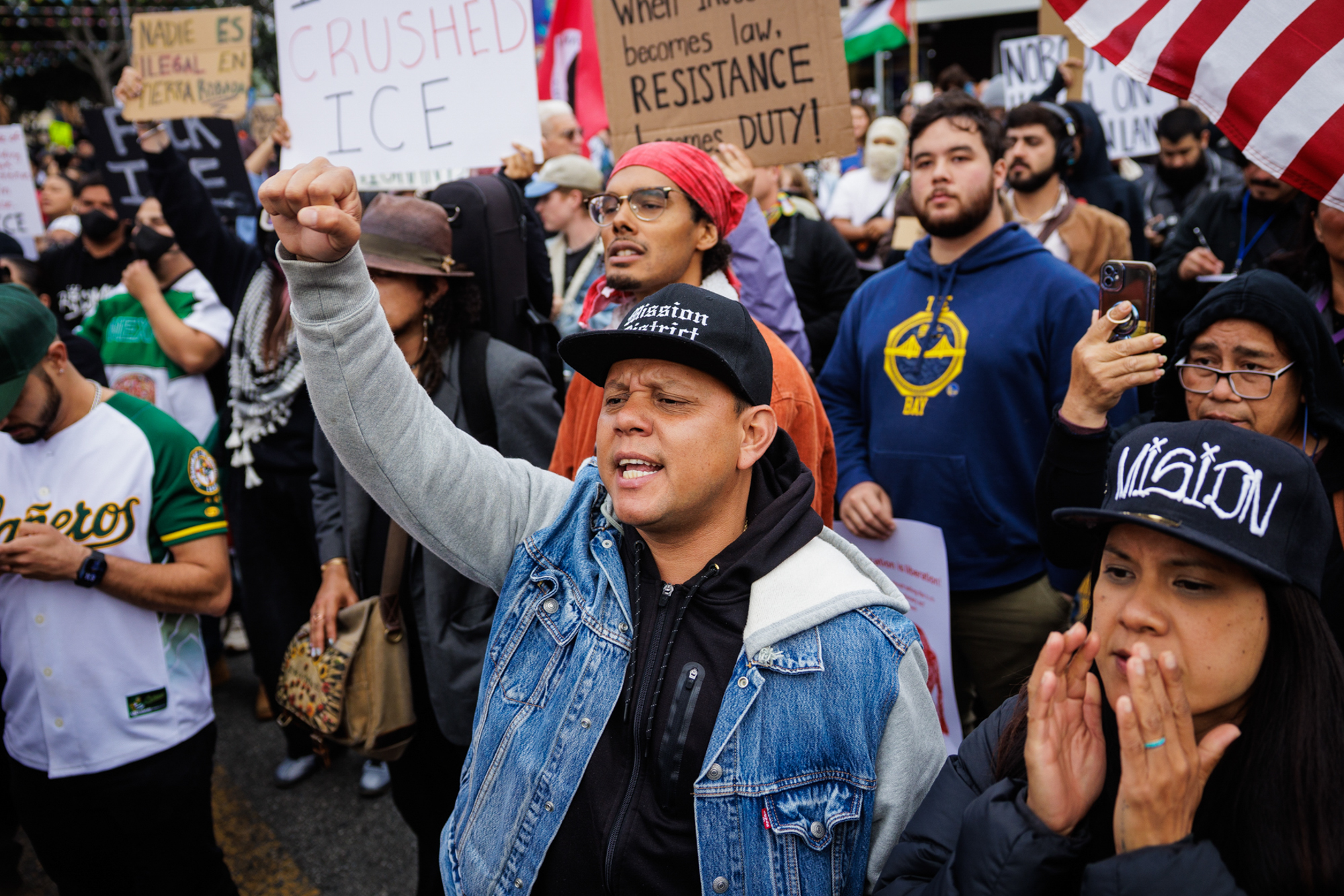 Jesus Cortes and other protestors rally in the Mission District in San Francisco on June 9, 2025. (Martin do Nascimento/KQED)