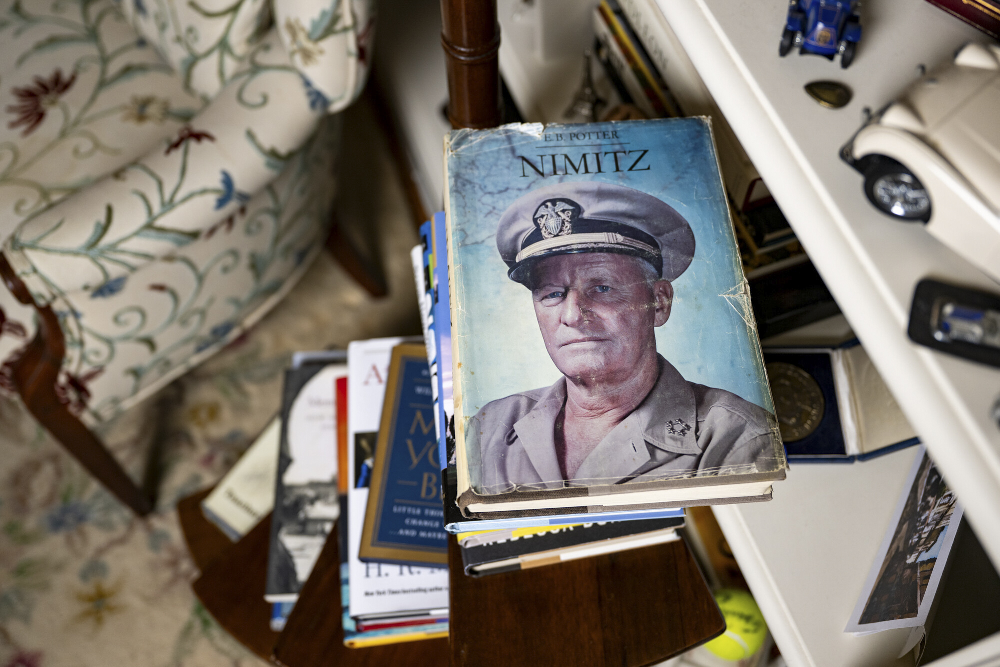 A book about Admiral Chester Nimitz sits in the living room of Ret. Rear Admiral John Bitoff in San Francisco on Oct. 21, 2025. (Beth LaBerge/KQED)