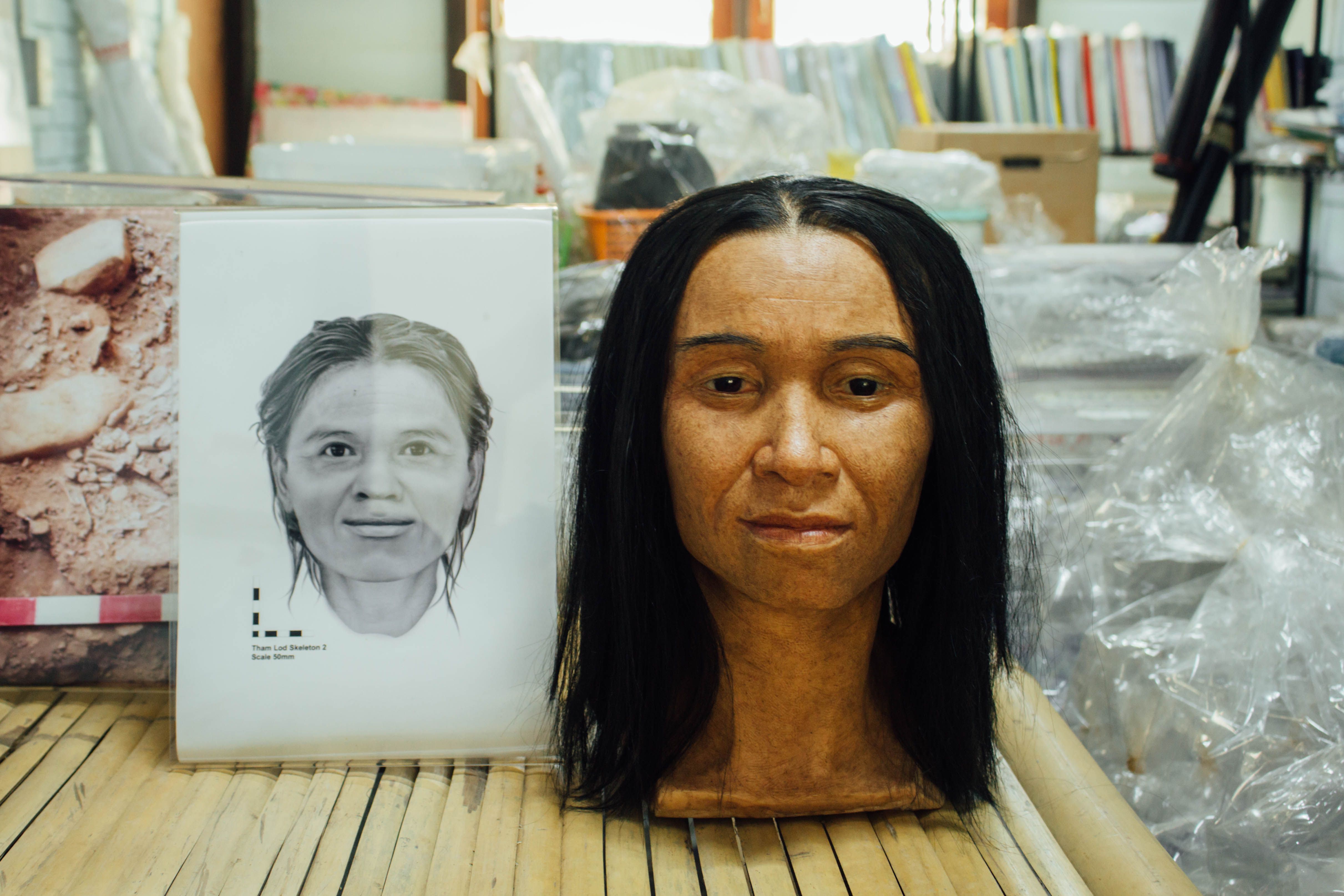 โปสเตอร์งานวิจัยที่ขึ้นรูปโครงหน้าผู้หญิงอายุ 13,000 ปี ซึ่งเจอที่แหล่งขุดค้นเพิงผาถ้ำลอด เป็นหลักฐานว่าบริเวณนี้มีคนอยู่อาศัยมายาวนาน