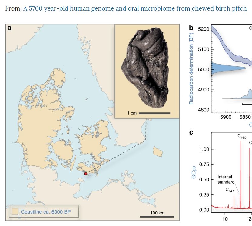 อันนี้เป็นซากหมาก (ยางไม้ที่ถูกเคี้ยว) อายุ 8000 ปี เจอที่สวีเดน เก่าแก่กว่าที่ค้นพบล่าสุดอีก แต่ไม่เจอ DNA ที่สมบูรณ์เท่า เอารูปมาลงให้ดูว่าตัวอย่างนี้เห็นรอยฟันชัดดี –1