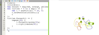 Showing how to create multiple turtles in Kojo, and make them wander around. Uses Scala features map and foreach.
