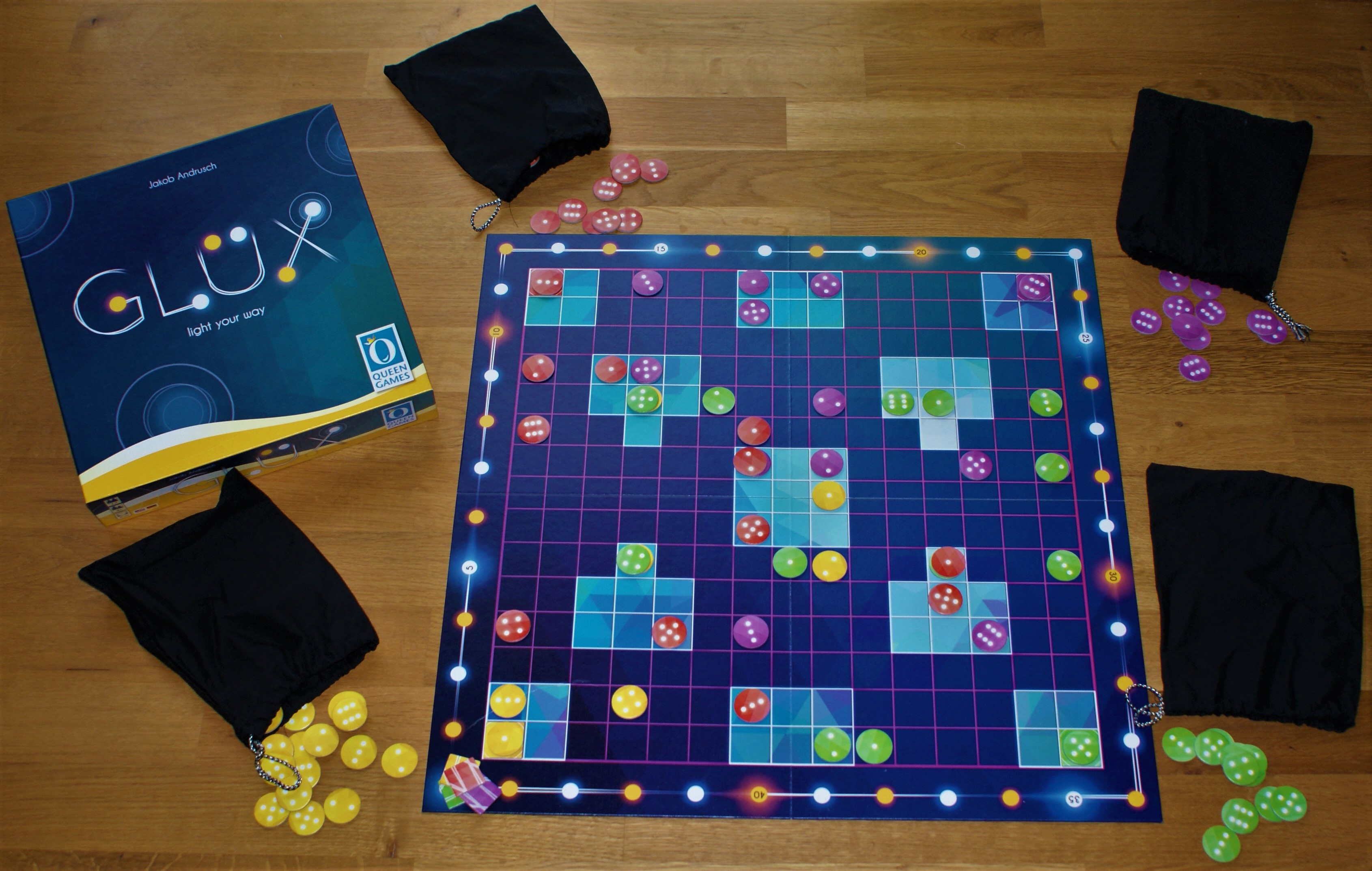 Spielaufbau: “Glüx” Verlag: Queen Games Designer: Jakob Andrusch Illustrator: Claus Stephan Spielerzahl: 2-4 Spieldauer: ca. 30-45 Minuten Alter: 08+ Erscheinungsjahr: 2016