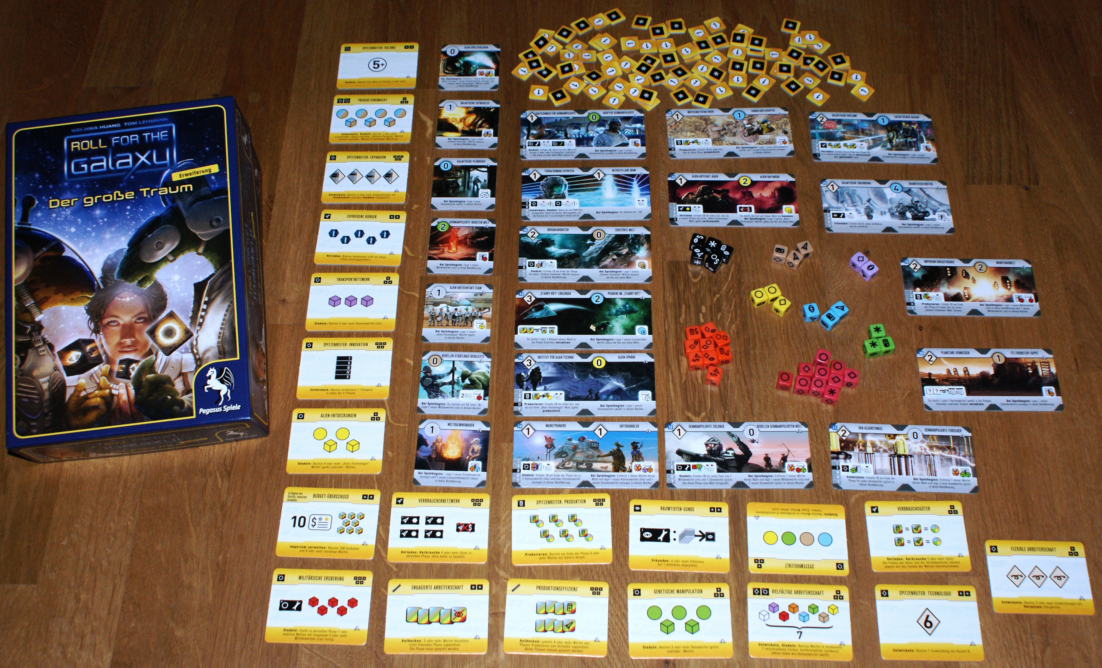 Spielmaterial: “Roll for the Galaxy – Der große Traum” Verlag: Pegasus Spiele Designer: Wei-Hwa Huang, Thomas Lehmann Illustrator: Martin Hoffmann, Claus Stephan, Mirko Suzuki Spielerzahl: 2-5 Spieldauer: ca. 30-60 Minuten Alter: 14+ Erscheinungsjahr: 2016